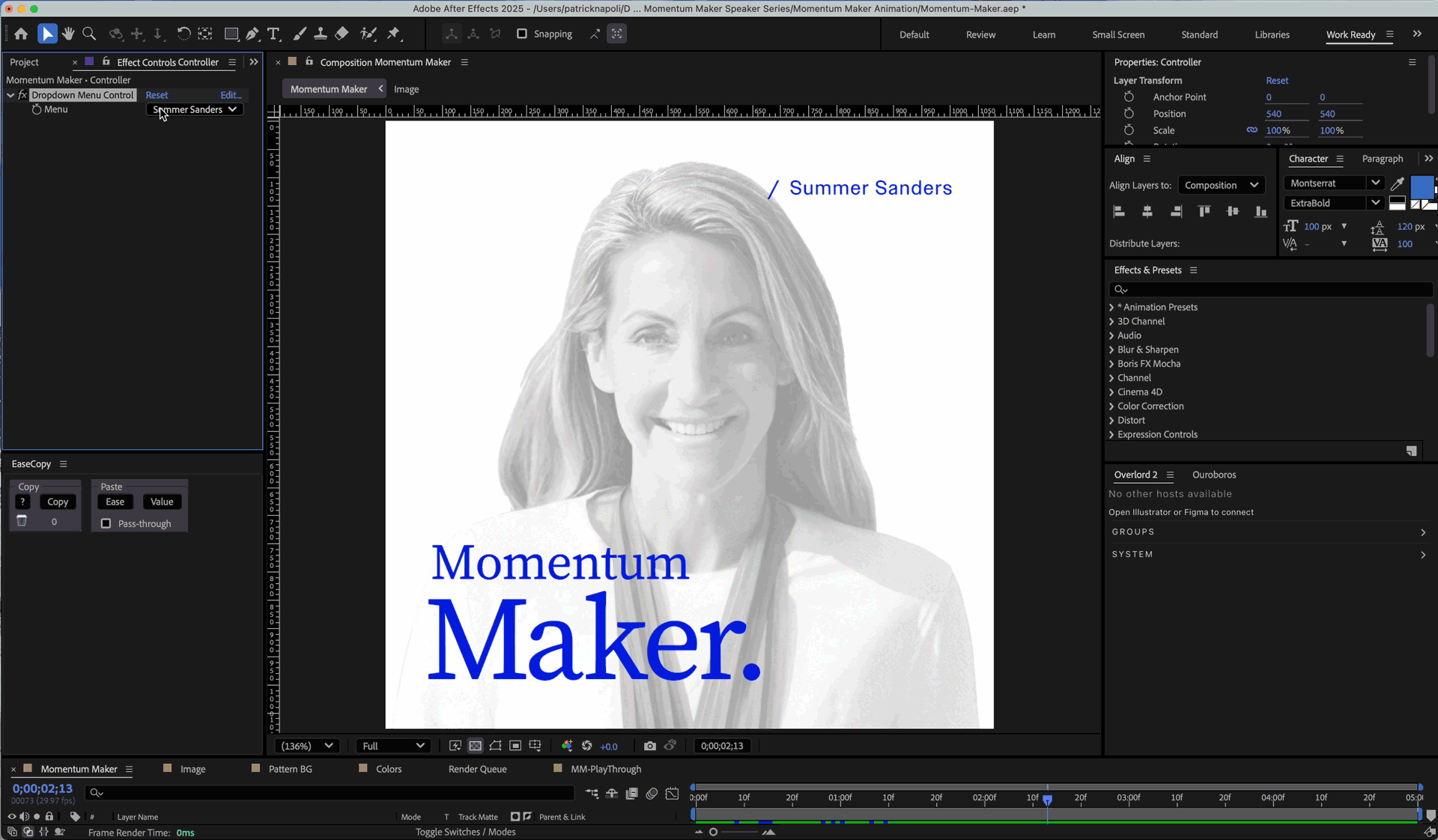 With speakers constantly changing, I needed a way to update the Momentum Maker animation easily and efficiently. I developed a rig that allowed me to add new images seamlessly and kept the animation intact.